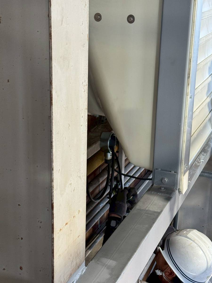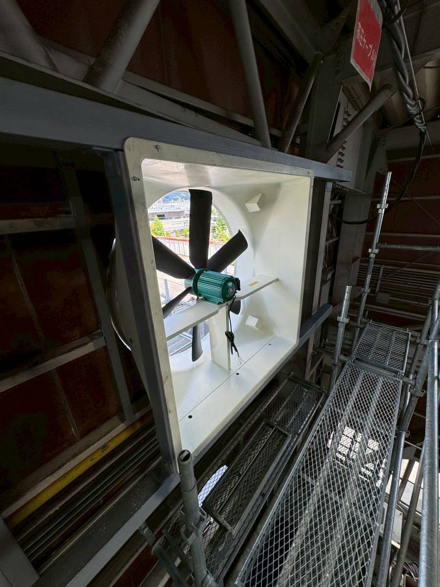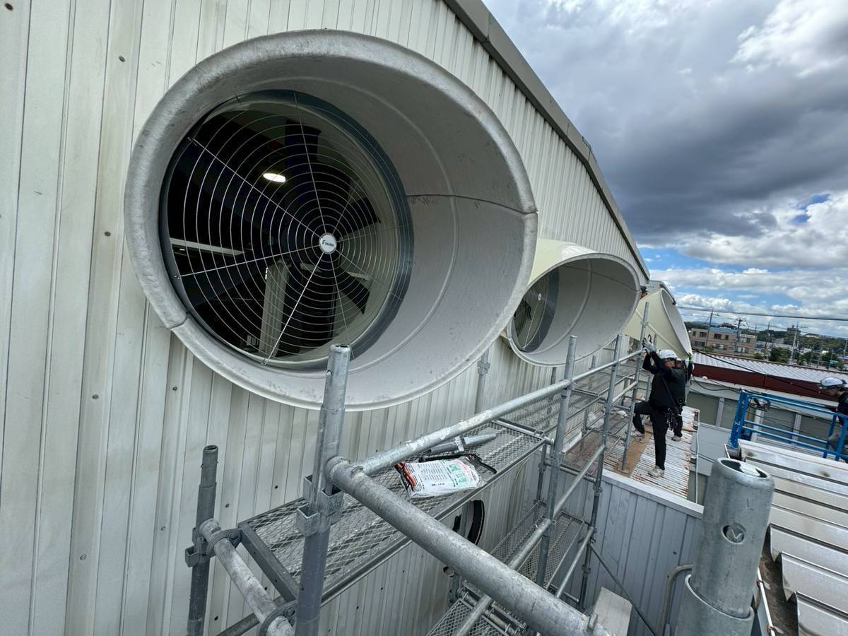 まず、建屋内外にファン取付用の仮設足場を設置し、安全かつ効率的に作業を行える環境を整え、次に既設配管の移設作業を行い新たに取り付けるファンが収まるスペースを確保しました。