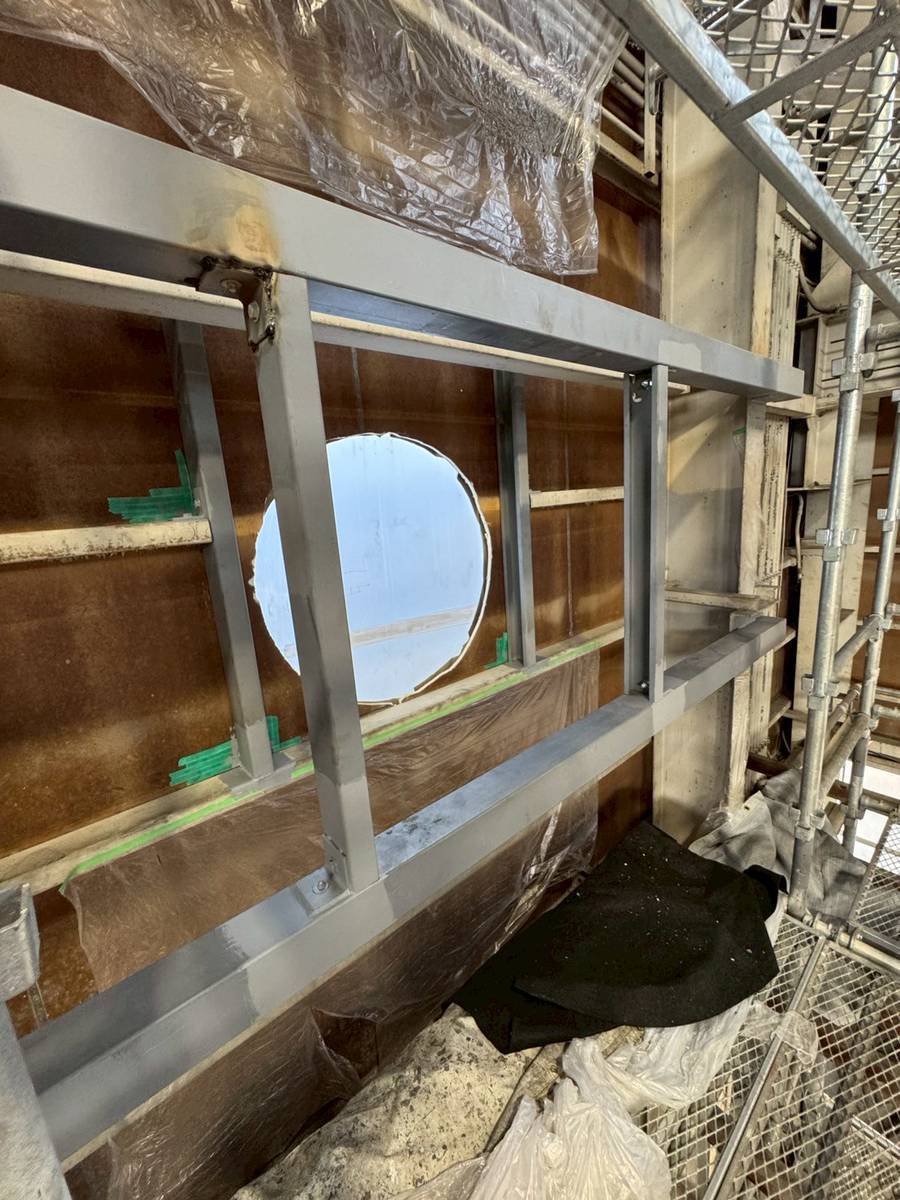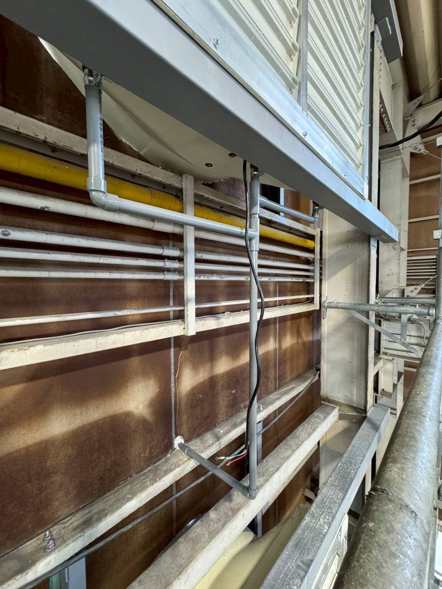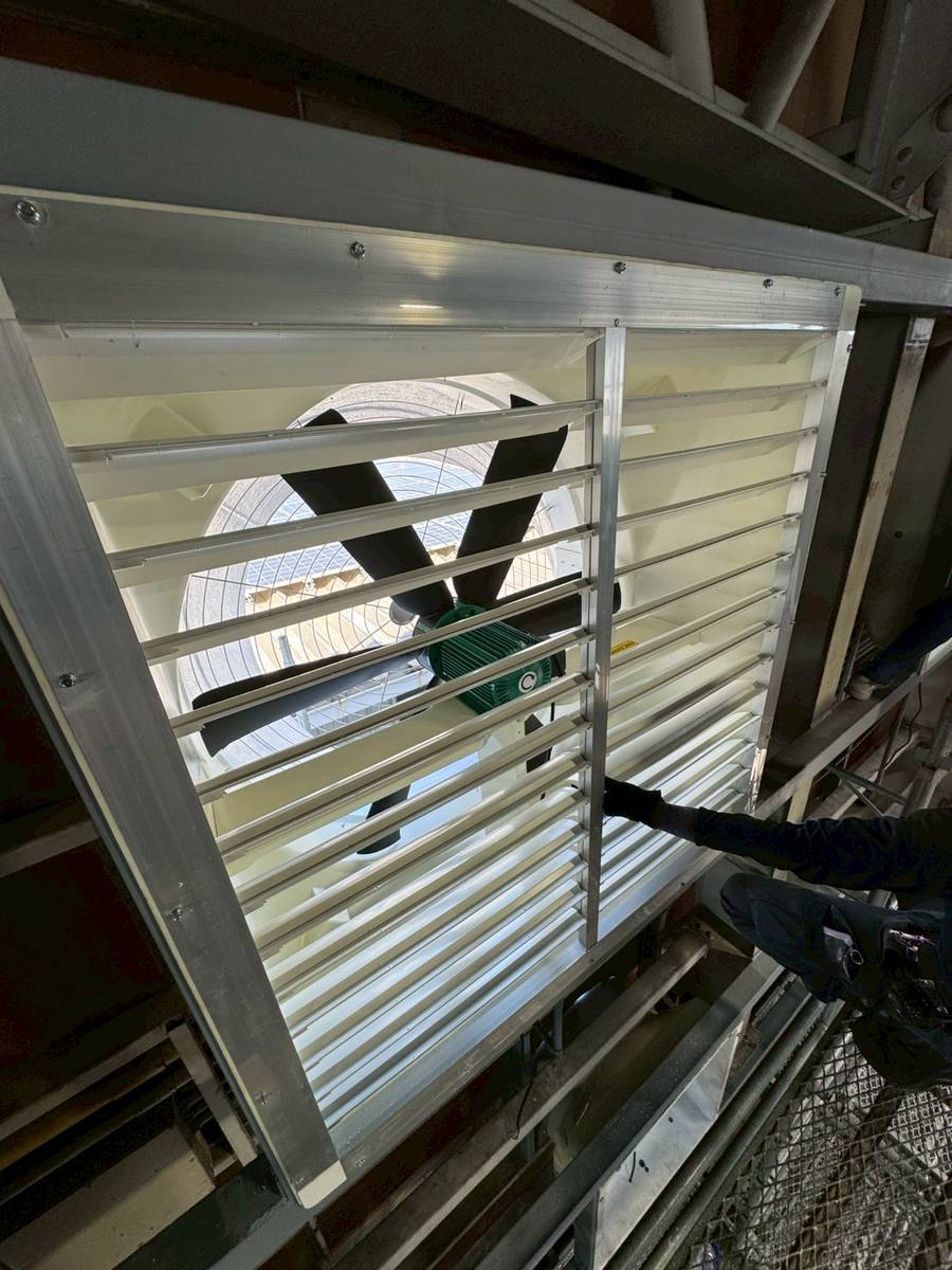 まず、建屋内外にファン取付用の仮設足場を設置し、安全かつ効率的に作業を行える環境を整え、次に既設配管の移設作業を行い新たに取り付けるファンが収まるスペースを確保しました。